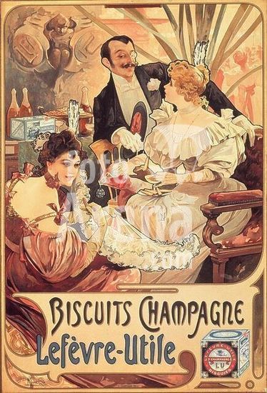 akg1006803 Baked goods / Biscuits.-"Biscuits Champagne / Lefèvre-Utile".-(Ad for biscuits from Lefèvre-Utile, Nantes, founded in 1896 by Louis Lefèvre-Utile). Poster, 1896. Design: Alfons Mucha (1860-1939). Colour lithograph. Print: F.Champenois. Museum: Mucha Trust., MUCHA.
