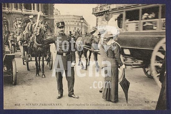 akg1567390 Polizei / Verkehrspolizei. /-"SCENES PARISIENNES. Agent réglant la circulation des voitures et des pietons".-(Verkehrspolizist auf der Place de l'Opéra in Paris). Fotopostkarte, undatiert, um 1910 (ND Phot / Gebrüder Étienne und Antonin Neurdein). Nr. 4014 der Serie: Scènes parisiennes. Museum: Private Collection., Paris.