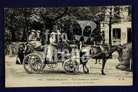 akg1063500 Pferdedroschke / Droschkenkutscherin.-"Au bois, un jour de bombe".-(Erste Zulassungen von Frauen zum Fuhrwesen in Paris: Damen bei einer Spazierfahrt mit einer Droschkenkutscherin).-Fotopostkarte, 1907 (C.M.). Aus einer Serie: Paris Moderne. Les femmes cocher. Museum: Private Collection., Paris.