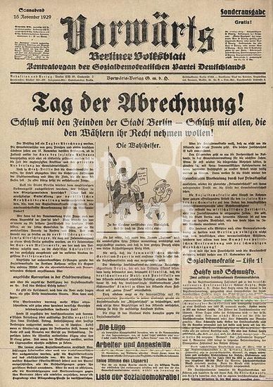 akg1964551 Weimarer Republik / Berlin, 17. November 1929. Wahlen zur Stadtverordnetenversammlung (Die NSDAP zieht erstmals ins Landesparlament ein mit 13 von 225 Mandaten).-"Tag der Abrechnung (...)".-Titelseite der Zeitung "Vorwärts", Zentralorgan der Sozialdemokratischen Partei Deutschlands, Sonderausgabe, Sonnaben... Museum: Coll. Archiv f. Kunst Geschichte., BERLIN.