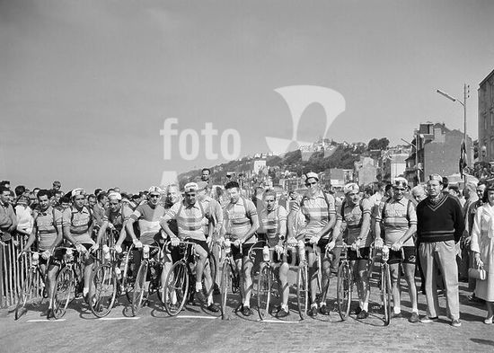 akg1128997 Sport / Radsport / Radrennen "Tour de France". / 42. Tour de France, 7. bis 30.Juli 1955 in 22 Etappen über 4 476 km von La Havre nach Paris. /-Am Start in Le Havre (Département Seine-Maritime) am 7. Juli 1955: Die spanische Nationalmannschaft mit Francisco Alomar, Salvador Botella, Gabriel Company, Antonio Gelabert, Jesus Lorono, ...
