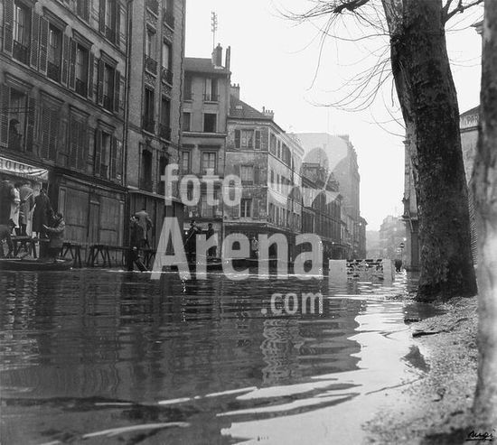 akg1545660 Paris (France), Seine.-Flood of the River Seine in January 1955: wooden walkway installed to allow the inhabitants of Courbevoie to run their daily errands despite the floodings.-Photo, January 1955.