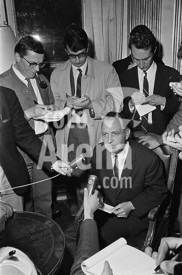 akg727258 The conclusion of the 'Grenelle Agreemen ts', 27 May 1968, after two days of nego tiation (25 and 26 May 1968). Eugène Des camps, Secretary General of the C.F.D.T. (Confédération Française Démocratique d u Travail, French Democratic Confederati on of Labour) answers journalists' quest ions.