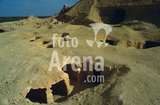 akg999901 Oase Siwa (Westliche/Libysche Wüste, Ägpyten), Hauptort Siwa, Berg der Toten / Gebel el-Mawta/el-Mota (Nekropole, 1.Jahrtausend v.Chr. bis Römerzeit).-Eingänge zu Felsgräbern auf dem Berg der Toten.-Foto, undatiert.