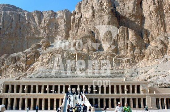 akg809114 Western Thebes (Upper Egypt), Deir el-Bahri ("The Northern Monastery") terraced temple of Queen Hatshepsut (mortuary temple of Queen Hatshepsut; New Kingdom, 18th dynasty, ca.1470 BC; architect: Senemut).-General view.-Photo, undated.