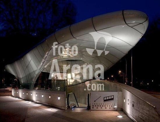 akg1063291 Innsbruck (Tirol, Österreich), Hungerburgbahn (Standseilbahn, Neubau, Inbetriebnahme 2007; Arch.: Zaha Hadid).-Teilansicht: Talstation Congress, außen, bei Nacht.-Foto, 2009.