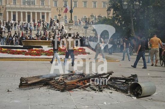 akg1041777 Greece / economic crisis 2010 (imminent national bankruptcy), general strike against the Greek government's austerity programme, 5.5.2010.-Violent clashes during a mass rally in Athens (3 people died after an arson attack on a branch of the Engnatia Bank in Athens' Stadiou street): street scene .-/ Photo.