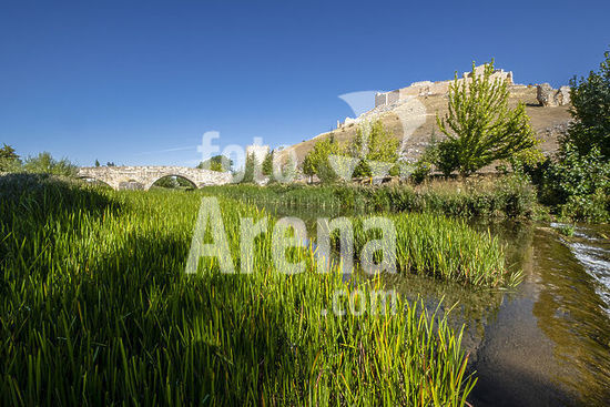 alb22608431 Roman bridge over the Ucero River and Osma Castle, El Burgo de Osma, Soria, Castile and León Autonomous Community, Spain, Europe.