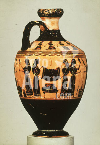 akg3003527 Griechische Vasenmalerei, attisch, schwarzfigurig, archaisch, dem Amasis-Maler zugeschrieben, um 550/530 v. Chr. - Frauen beim Spinnen der Wolle und beim Zusammenlegen des gewebten Tuches. - Lekythos. Ton, gebrannt, schwarz bemalt. Höhe 17,15 cm, Durchmesser 10,2 cm. (Beazley ABV 154,57). Fletcher Fund, 1931 (31.11.10). New York, Metropolitan Museum of Art. Museum: New York, Metropolitan Museum of Art.