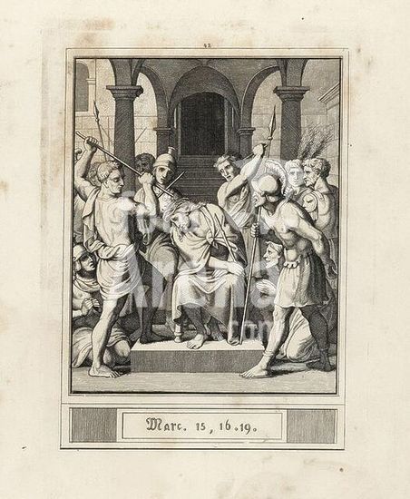 akg321149 Olivier, Friedrich. 1791-1859. "Die Geißelung Christi". (Markus 15,16-19). Kupferstich nach Zeichnung von Olivier. Aus: Volks-Bilder-Bibel. Mit 50 Darstellungen aus dem Neuen Testament. Text von Gotthilf Heinrich von Schubert, Gotha, 1836, Nr. 42. Berlin, Sammlung Archiv für Kunst und Geschichte. Museum: Berlin, Sammlung Archiv für Kunst und Geschichte.
