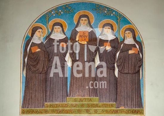 akg3761957 Krebs, Paulus, 1849 - 1935, German artist. Five Benedictine nuns: St Margareth of Rupertsberg, St Hildegard of Rupertsberg, St Jutta of Spanheim, St Ida of Rupertsberg, St Elizabeth of Schönau. Painting, 1913. St Hildegard Monastery, Eibingen, Ruedesheim, Hesse, Germany.