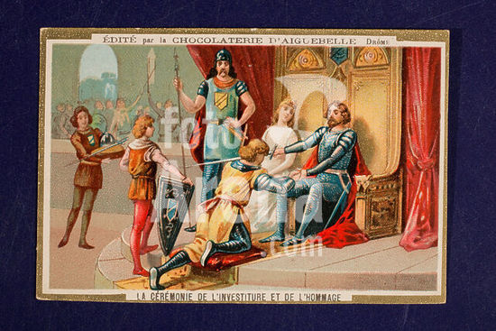 akg4883670 Rittertum / Ritterschlag. - "La cérémonie de l'investiture et de l'hommage". - Farblithographie, anonym, undatiert, Frankreich, um 1880/90. Sammelbildchen der Frma "Chocolaterie d'Aiguebelle, Monastère de la Trappe (Drôme). Privatsammlung.