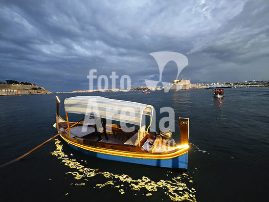 alb21281311 traditional Maltese boat (dghajsa), Fort Saint Angel (Forti Sant'Anglu) on the backgroun, Valletta, Republic of Malta, Europe.