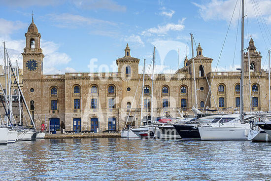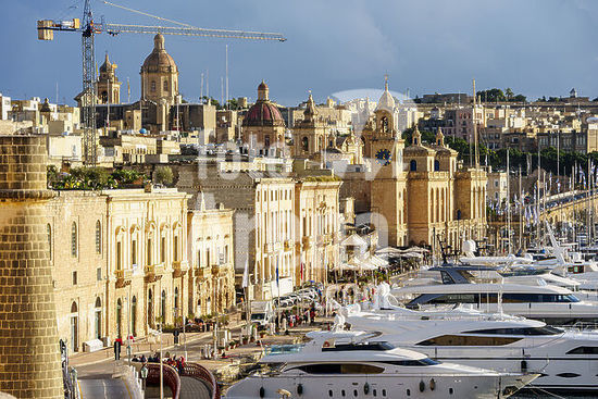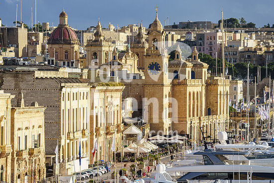 alb21281560 waterfront with historic buildings and luxury boats, Vittoriosa neighborhood (Birgu), Valletta, Republic of Malta, Europe.