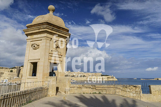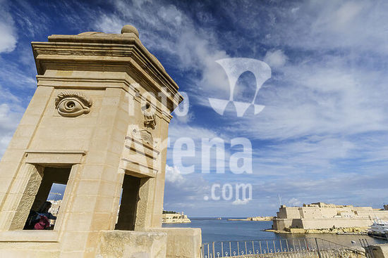 alb21281347 Gardjola Gardens, 1551, watchtower decorated with symbols of vigilance, Senglea neighborhood (Isla), Valletta, Republic of Malta, Europe.