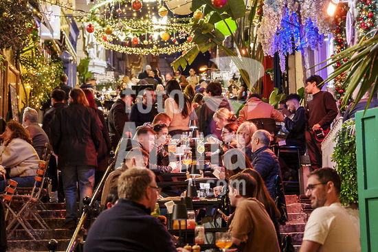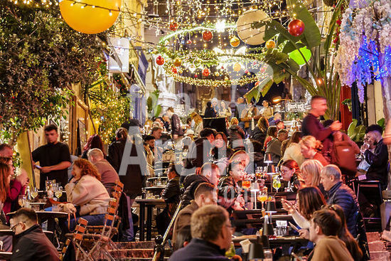 alb21281305 Tables on the steps creating a terrace, typical street in the city center, Valletta, Republic of Malta, Europe.