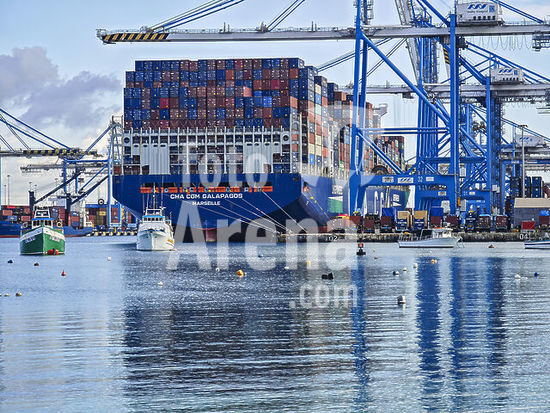 alb21281304 Large container ship with working cranes, Birzebbuga, Republic of Malta, Europe.