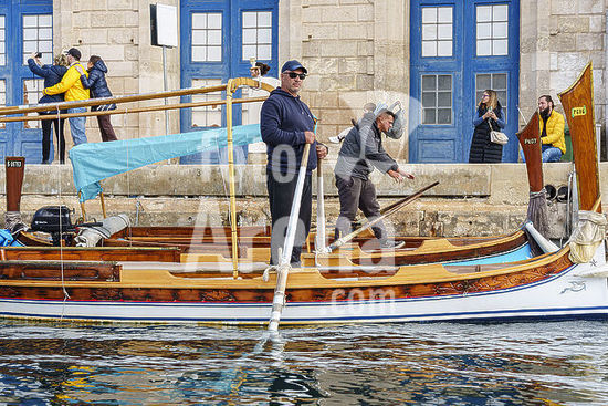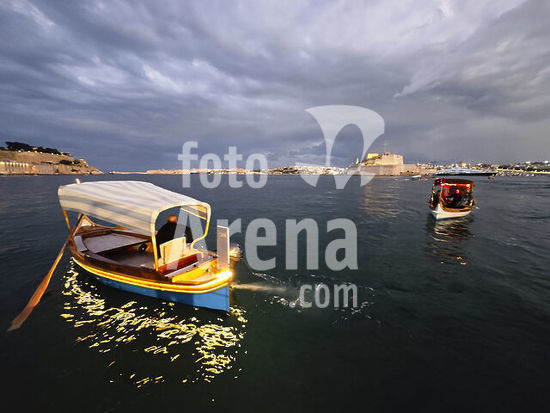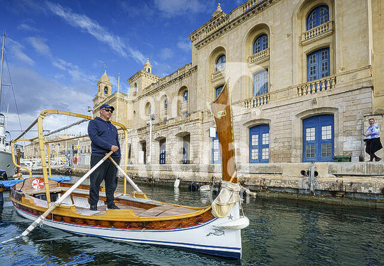 alb21281556 Il-Birgu Water Taxi station, traditional Maltese boat (dghajsa), Valletta, Republic of Malta, Europe.