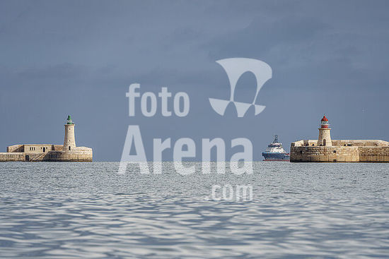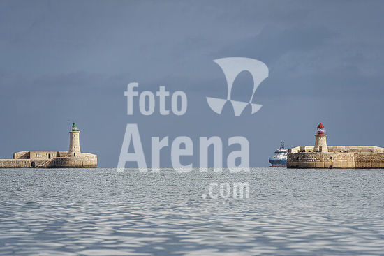 alb21281550 port entrance with the Saint Emo and Ricasoli East lighthouses, Valletta, Republic of Malta, Europe.