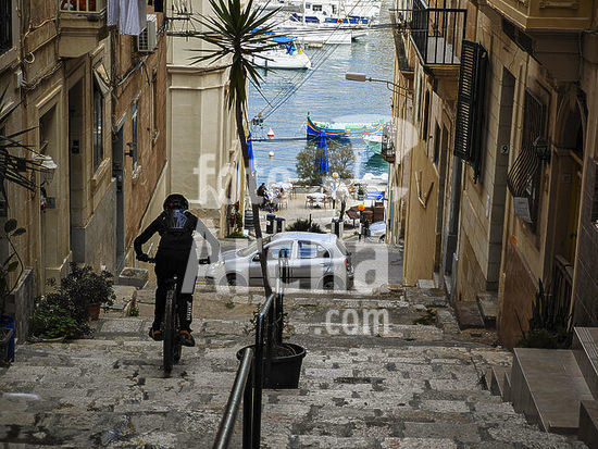 alb21281568 cyclist going down the stairs, Senglea neighborhood (Isla), Valletta, Republic of Malta, Europe.
