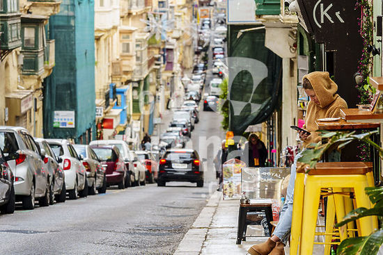 alb21281303 Tables on the steps creating a terrace, typical street in the city center, Valletta, Republic of Malta, Europe.