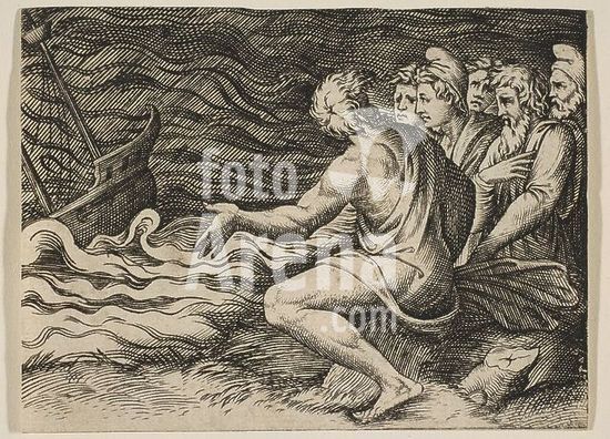 alb3661779 A group of figures at right witnessing a shipwreck. Artist: Marco Dente (Italian, Ravenna, active by 1515-died 1527 Rome); After Francesco Salviati (Francesco de' Rossi) (Italian, Florence 1510-1563 Rome). Dimensions: Sheet (Trimmed): 2 5/8 × 3 9/16 in. (6.6 × 9 cm). Date: ca. 1515-27. Museum: Metropolitan Museum of Art, New York, USA.