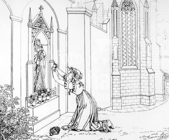akg004292 Goethe, Johann Wolfgang von; 1749-1832. Werke: Faust (1808). Gretchen vor dem Andachtsbild der Mater dolorosa. Umrißradierung, 1816, nach Zeichnung, um. 1808/10, von Moritz Retzsch (1779-1857). 17. Blatt der Folge: Umrisse zu Goethe's Faust, gezeichnet von Retsch, Stuttgart und Tübingen (J.G.Cotta) 1816. Berlin, Sammlung Archiv für Kunst und Geschichte. Museum: Berlin, Sammlung Archiv für Kunst und Geschichte.