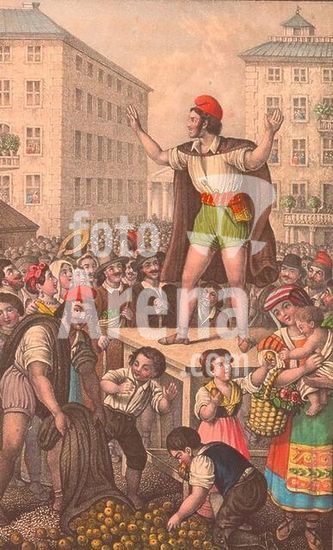 Geschichte / Florenz / Pazzi-Verschwörung (Verschwörung des Florentiner Patriziats gegen die herrschende Familie Medici, die durch Francesco de' Pazzi und Girolamo Riaro ersetzt werden sollten) / Anschlag auf die Brüder Lorenzo und Giuliano de' Medici während des Hochamts am Ostersonntag dem 26. April 1478 im Dom Santa Maria del Fiore (Giuliano fällt dem Anschlag zum Opfer, Lorenzo entkommt verletzt). - "Die Pazzi-Verschwörung". - Gemälde, um 1862, von Angelo Fabbrini (1830-1889). Öl auf Leinwand, 138 x 115 cm. Inv. Nr. Acc. 373, Florenz, Palazzo Pitti, Galleria d'Arte Moderna.