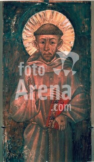akg019154 St Francis (Francesco) of Assisi, orig. Giovanni Bernardone, Founder of the Franciscan Order Assisi 1181/82 - 3.10.1226. Full-length portrait. Fresco, 1228, by the Master of St. Francis of Assisi (1st third C13th). St. Gregory's chapel of Sacro Speco. (Monastery of San Benedetto) in Subiaco. Author: MEISTER DES HEILIGEN FRANZISKUS VON ASSISI.