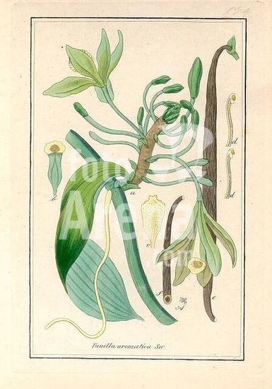 akg022956 Botanik:. Vanille / Vanilla planifolia. "Vanilla aromatica Sw". Radierung, koloriert, um 1810. Unbezeichnet. 17,5 × 11 cm. Berlin, Sammlung Archiv für Kunst und Geschichte. Museum: Berlin, Sammlung Archiv für Kunst und Geschichte.