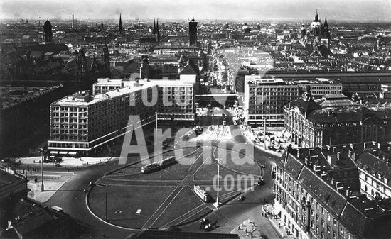 akg054980 Berlin-Mitte, Alexanderplatz. Blick auf die Bürohochhäuser (1929-32; P. Behrens) und die Königstraße. Rechts Kaufhaus Tietz, li. Polizeipräsidium. Im Hintergrund (v. l. n. r.) Stadthausturm, Petrikirche, St. Nikolai, Rathausturm, Schloßkuppel, Dom und Marienkirche. Foto, nach 1932.