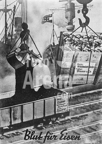 akg077101 Spanish Civil War, 1936-39. "Blut für Eisen" (Blood for Iron). Poster against Nazi support for Franco's troops. Photomontage, 1937, by John Heartfield. (1891-1968). Copyright: © John Heartfield. This artwork is not in the public domain. It is your responsibility to obtain all necessary third party permissions from the copyright handler in your country prior to publication.