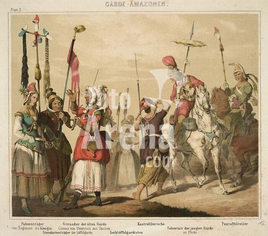 akg110373 Emancipation / Caricature. "Amazon Guards". Col. lithograph, c. 1850, by Ludwig Burger (1825-1884); 27.5 × 36cm. Sheet II of the series: "Das emancipirte Amazonen-Heer" (the emancipated Amazon Army) / 8 sheets compiled a. lithographed by Ludwig Burger, Berlin (August v. Schröter's Verlag) n. d. (c. 1850). Berlin, Sammlung Archiv für Kunst und Geschichte. Museum: Berlin, Sammlung Archiv für Kunst und Geschichte.
