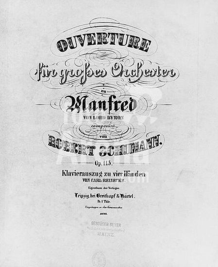 akg116506 Schumann, Robert Composer; 1810-1856. Works: Manfred. Dramatic poem in three sections by Lord Byron, op. 115. (1848/51). - Title page of the printed score: overture for grand orchestra (...) piano score f. four hands by Carl Rittmeister, Leipzig (Breitkopf & Härtel) n. d. Berlin, Sammlung Archiv für Kunst und Geschichte. Museum: Berlin, Sammlung Archiv für Kunst und Geschichte.