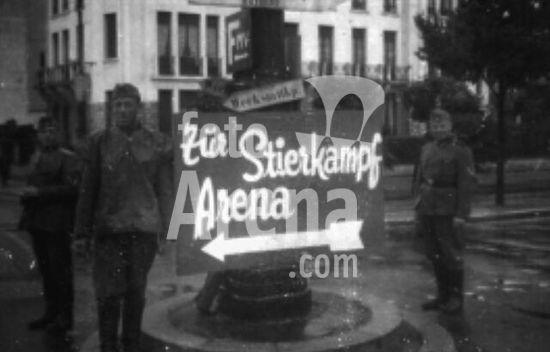 akg140501 Spanish Civil War 1936-1939. After agreements between Franco and Hitler, German troops (the Condor Legion). are sent to Spain from 1 August 1936. Condor Legion soldiers in Bayonne; sign saying "Zur Stierkampf Arena" (To the Bullfight Arena). Amateur photo taken by a German officer, c. 1936.