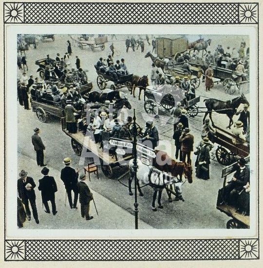 akg159469 Weimar Republic / Assassination of Foreign Minister W.Rathenau by young nationalists, 24 June 1922. General strike in Berlin on the day of the funeral, 27 June 1922. Private horse carriages and carts replace public transport. Photo (coloured). (Reproduction: print).