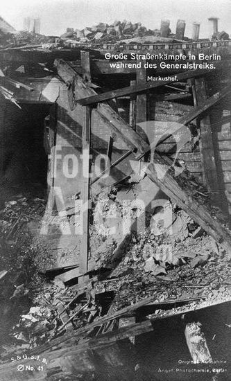 akg167428 Berlin, 3.-12. März 1919 / Generalstreik der Arbeiterschaft / Reichswehrminister Noske verhängt den Belagerungszustand und läßt Truppen gegen die Streikenden vorgehen. Straßenkämpfe in Berlin: Zerstörtes Gebäude (Markushof). Foto, um März 1919. Berlin, Sammlung Archiv für Kunst und Geschichte. Museum: Berlin, Sammlung Archiv für Kunst und Geschichte.