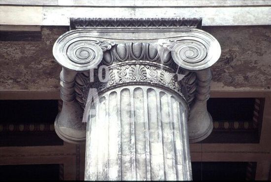 akg184492 Berlin-Mitte, Altes Museum. (1823-29 erbaut; Arch.: Karl Friedrich Schinkel; im 2. Weltkrieg ausgebrannt, 1966 wiederhergestellt). Detail: Ionisches Kapitell der Vorhalle. Foto, undat.
