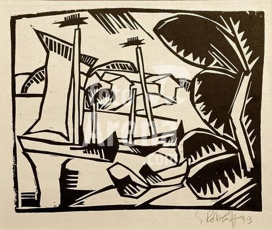 akg1913122 Schmidt-Rottluff, Karl. 1884-1976. "Bucht an der Nehrung", 1913. Holzschnitt, 48 × 67,5 cm. Inv. Nr. D 856. Bielefeld, Kunsthalle. Museum: Bielefeld, Kunsthalle. Copyright: © Karl Schmidt-Rottluff. This artwork is not in the public domain. Additional copyright clearance may be required before use of this image.