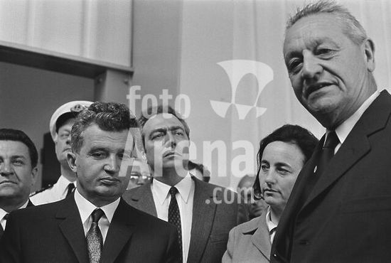 akg1948393 Ceausescu, Nicolae ; homme politique roumain (à partir de 1965, chef du parti communiste roumain ; 1967-1989 chef d'État) ; Scomicesti 26.1.1918 - (tué à la carabine). Targoviste 25.12.1989. Ceausescu (à g.) et sa femme Elena visitant une entreprise française à Nîmes (au centre : François-Xavier Ortoli). Photo, 18 juin 1970. Copyright: For editorial use only.