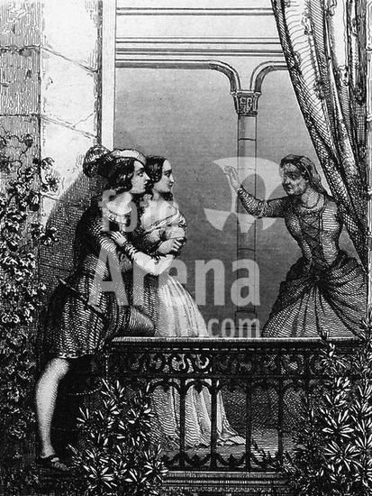 akg222996 Shakespeare, William, 1564 - 1616, English poet, playwright and actor. Works: Romeo and Juliet (play), premiere, 1595/96. Romeo and Juliet. Copperplate engraving by Alexandre Lacauchie. Paris, Bibliothèque Nationale. Museum: Paris, Bibliothèque Nationale.
