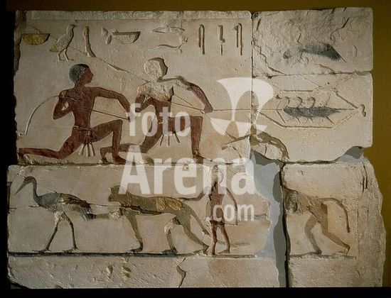 akg229360 Art égyptien, Ancien Empire, 4e dynastie, v. 2613-2494 av. J.-C. - (En haut :) jeunes garçons attrapant des oiseaux. (En bas :). enfant jouant avec des singes. Relief coloré. Provenance: Meidoum (Égypte), tombe de Nefermaat et de son épouse Atet. Copenhague, Ny Carlsberg Glyptothek. Museum: Kopenhagen, Ny Carlsberg Glyptothek.