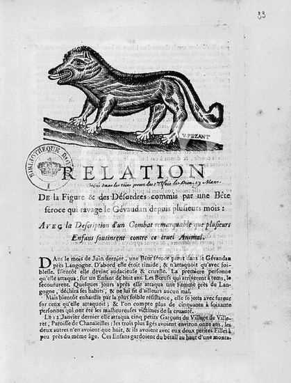 akg229632 Fantasy creatures: "La bête du Gevaudan, (monster, probably a lynx or a wolf, active c. 1764 in Gevaudan, Lozère, in France; slain on 20 September 1765). "Relation de la Figure & des Desordres (..). Woodcut and type. Paris, Bibliothèque Nationale. Museum: Paris, Bibliothèque Nationale.