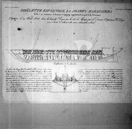akg239855 Society / Slavery. "Goélette espagnole 'La Josefa Maracayera'...". (Longitudinal and cross-sections of the Spanish schooner "La Josefa Maracayera", captured on 19 August 1822 off the coast of Benin with 216 slaves on board). Lithograph, contemporary. Paris, Bibliothèque Nationale. Museum: Paris, Bibliothèque Nationale.