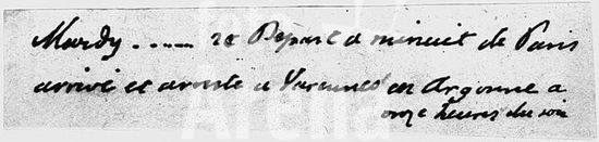 akg242416 Louis XVI, roi de France; Versailles 23. 8.1754 - (guillotiné à) Paris 21.1.1793. Fuite de Louis XVI à Varennes dans la nuit su 20 au 21 juin 1791 et arrestation le 22 juin: note autographe de Louis XVI indiquant l'heure de départ de Paris et d'arrivée à Varennes.