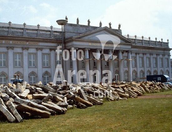 akg243250 Kassel (Hessen), Documenta 7, 19 June - 28 September. 1982. Blocks of basalt on Friedrichsplatz in front of the Fridericianum Museum in Kassel for the "7000 Eichen" (7,000 Oak Trees) project by Joseph Beuys. Photo, June 1982.