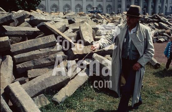 akg243260 Beuys, Joseph ; artiste allemand ; 1921-1986. - "Documenta 7", Kassel, 19 juin - 28 septembre 1982 : Beuys présentant des morceaux de basalte pour son action "7000 chênes". - Photo, juin. 1982. Copyright: For editorial use only.