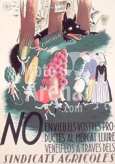 akg272690 Spanish Civil War 1936-39. "No envia els vostres productes al mercat lliure veneu los a traves dels Sindicats Agricoles" (Poster by Direccio General d'Agricultura against the black market trade). Colour print, undated, 110.5 × 78.9cm. Design: Evarist Mora (born 1904). Private collection. Copyright: Additional copyrights must be cleared.