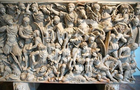 akg2788040 The Great Ludovisi Sarcophagus. Battle scenes between the Romans and the Germans who can be identified by their different clothing and their beards. Country of Origin: Italy. Culture: Ancient Roman. Date / Period: 3rd century AD. Credit Line:.