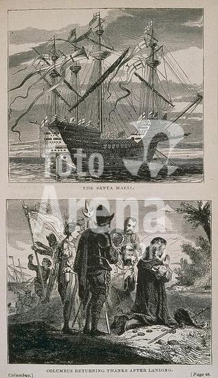 akg279162 Columbus, Christoph sailor, discoverer of America, 1451-1506. - Top: "The Santa Maria". Bottom: "Columbus returning thanks after landing". (on 12.10.1492 Columbus sets foot on the American continent at the Bahama island Guanahani). Woodcut. From: John Steven Cabot, Life and achievments of Columbus, 1879. 10882. a. 25., opp. 48. London, British Library. Museum: London, British Library. Copyright: Additional permissions needed for non-editorial use.